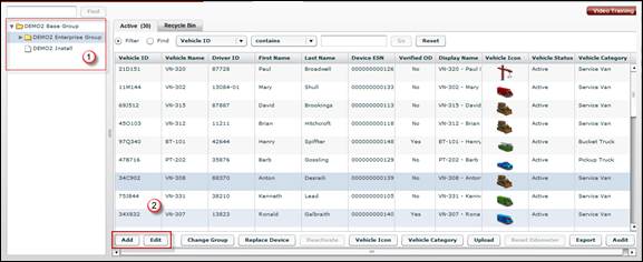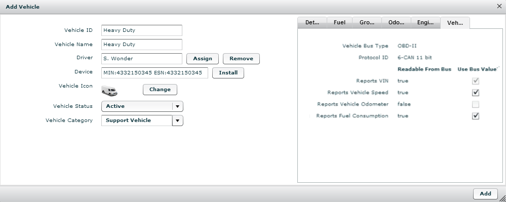 • The Add Vehicle screen displays. To edit an existing vehicle’s settings, select the vehicle from the Active list, and then click the Edit button. The Edit Vehicle screen displays.