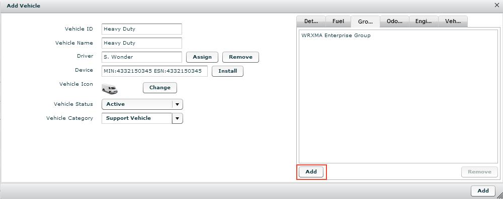 • Verify that you clicked the Add button associated with Groups tab and not the Add button for the Add Vehicle screen.
