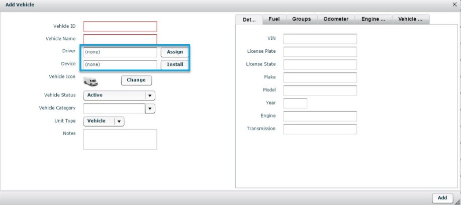 A vehicle is the basis of most of the organization within FleetOutlook. Each vehicle must have an assigned device to report data in FleetOutlook. While assigning a driver is not required, we recommend assigning a driver to each vehicle. This enables you to associate the vehicle activity with a specific driver and monitor work habits and performance.