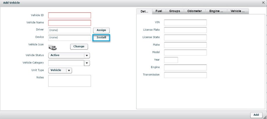 5. Click the Install button to assign a device to the vehicle.