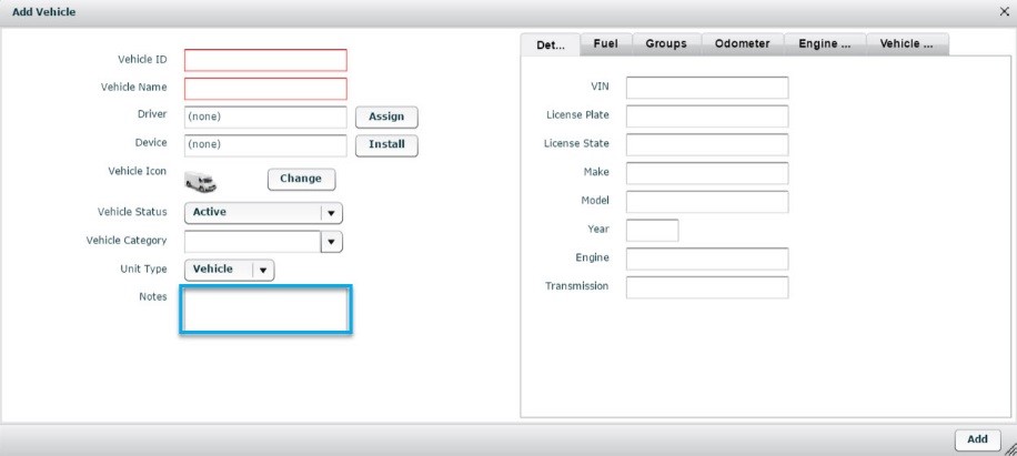 11. If needed, enter custom notes for the vehicle in the Notes field.