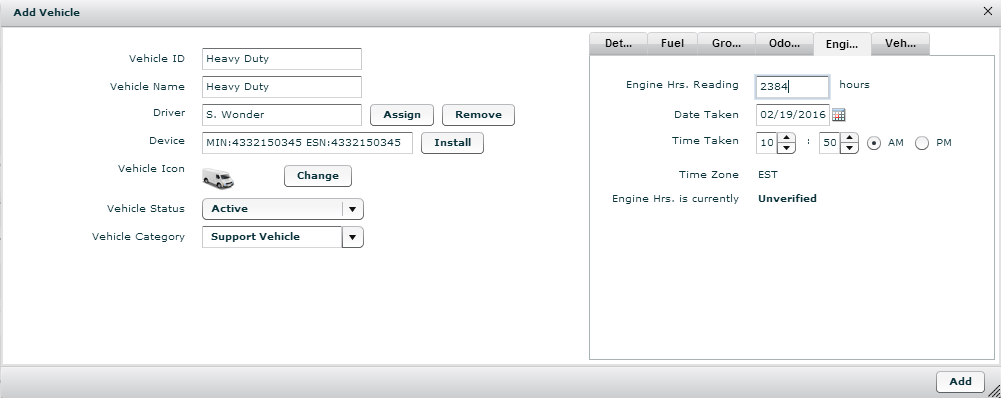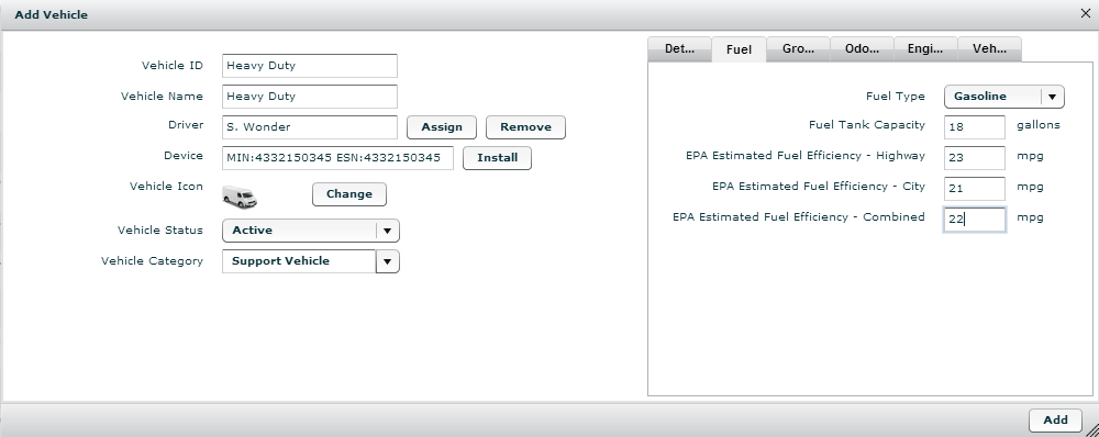 12. On the Details tab, populate vehicle identification fields. These fields are not required, but are used in FleetOutlook reports.
