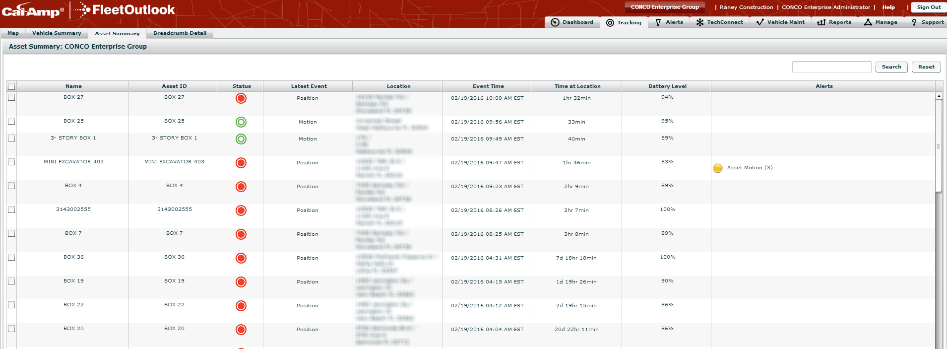 The Asset Summary tab is only visible to customers using the TTU-720 device. The Asset Summary displays a list of your assets, their current location and the amount of time that they are at the current locations.