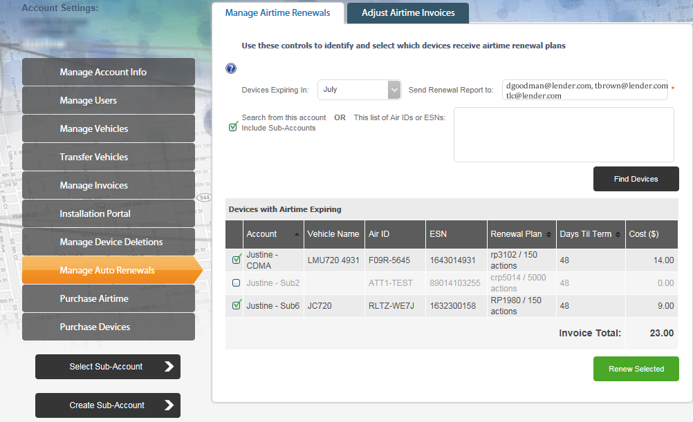 The Manage Airtime Renewals screen enables you to manage the airtime renewal plans for devices in your main account and sub-accounts.