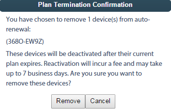 • Note: If you did not renew a device, LenderOutlook displays the Plan Termination Confirmation screen. Click the Remove button to remove the device from renewal.