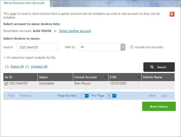 The Move Devices feature within the Installation Portal is used typically for resellers or finance companies that physically receive devices and then ship to a dealership or installer. Move Devices contains all the uninstalled devices in your account. From this list, you can easily move the devices into the dealer’s account or the installer sub-account.